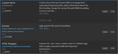배터리 모양 클릭 후 ' Emmet ' 플러그인 설치