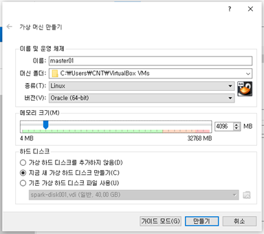 virtualbox를 설치하고 가상머신을 생성합니다.