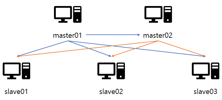 master노드에서 ssh키를 생성하고 slave에 접근할 수 있는 환경을 만듭니다. 본 포스팅에서 구축하려는 master-slave 아키텍처는 아래 그림과 같습니다. 따라서 master01과 master02에서 각키를 생성하고 slave01~03에 등록을 해줘야합니다.