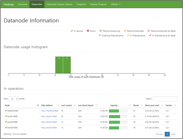 파일시스템 사용량, 저장된 데이터블럭의 상태(under replicated, corrupt block) 데이터노드 상태 등의 정보를 파악할 수 있습니다. 또한 web에서 master 머신(NameNode)의 9870포트로 접속하면 아래와 같이 GUI 인터페이스로 하둡의 상태를 확인할 수 있습니다.