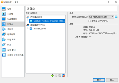 생성된 가상머신의 설정에서 저장소 탭에 centos 7 설치를 위한 디스크 iso파일을 삽입하고 부팅해서 운영체제를 설치합니다.