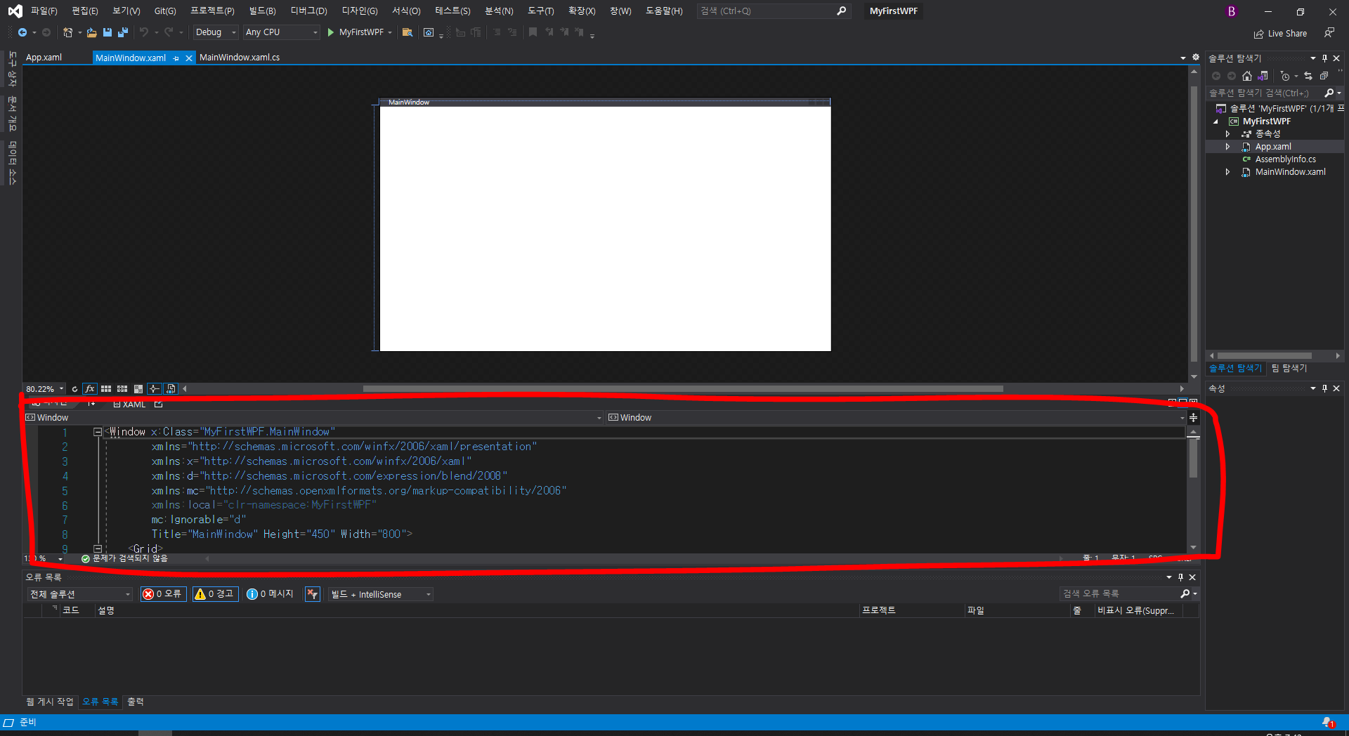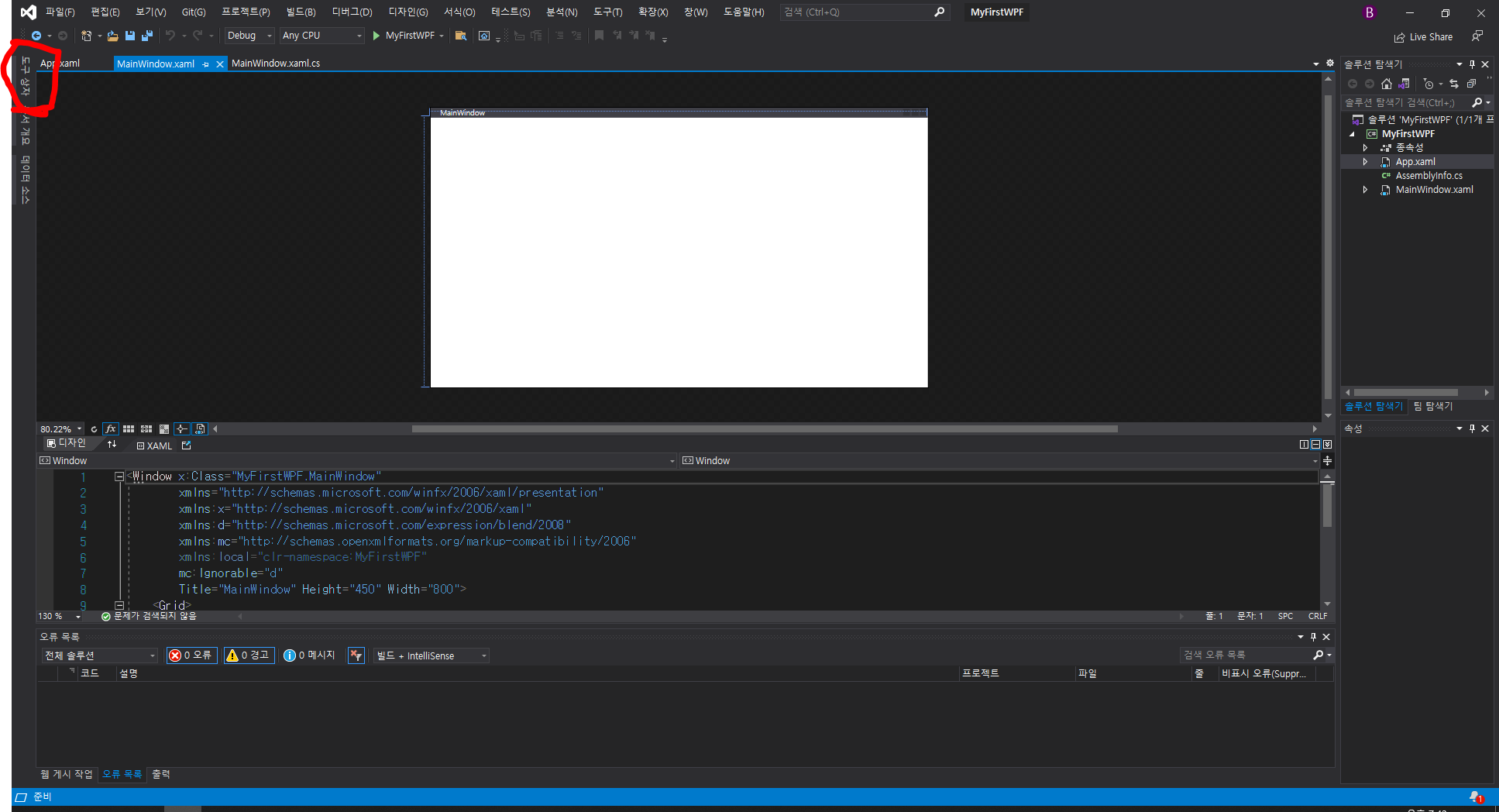 먼저 이 빨간색 부분은 WPF MainWindow의 미리보기 창입니다. XAML로 UI를 개발 하면서 값이 어떻게 바뀌는지 혹은 디자인이 어떻게 바뀌는지 볼 수 있습니다.