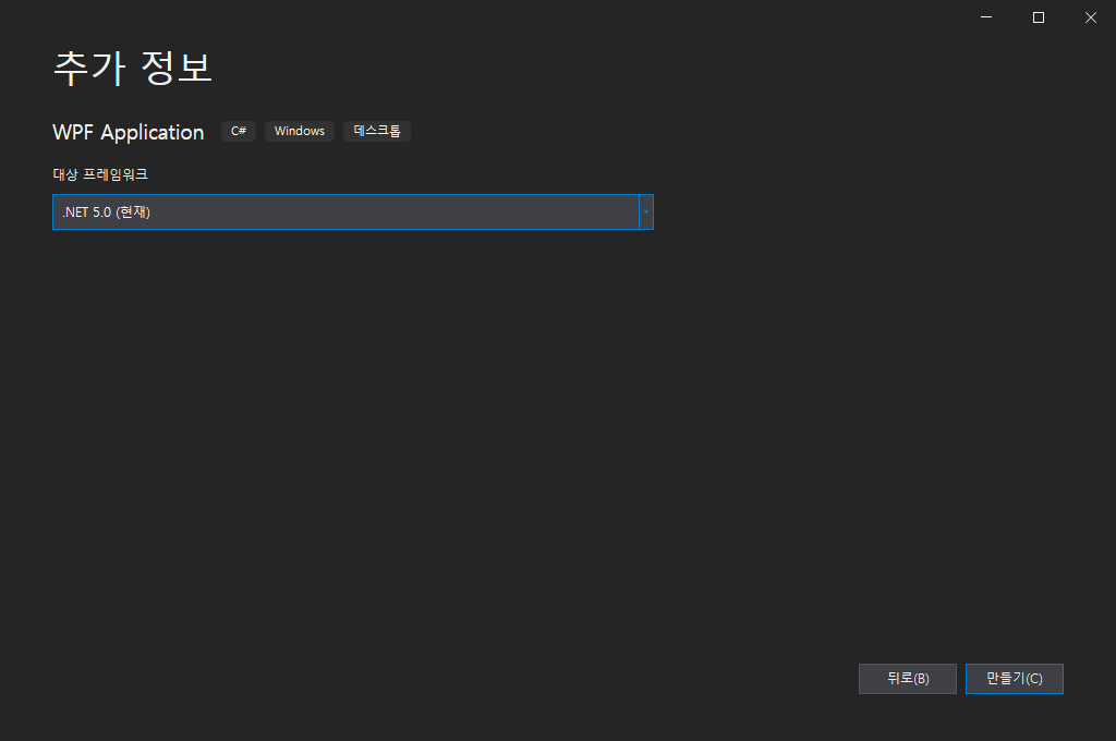 3) 대상 프레임워크를 ".NET 5.0 (현재)"로 설정해주고 "만들기"를 클릭합니다.