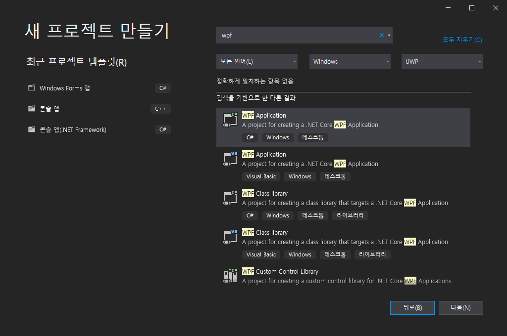 1) 먼저 Visual Studio를 실행하고 WPF 프로젝트를 검색하여 프로젝트를 만듭니다.