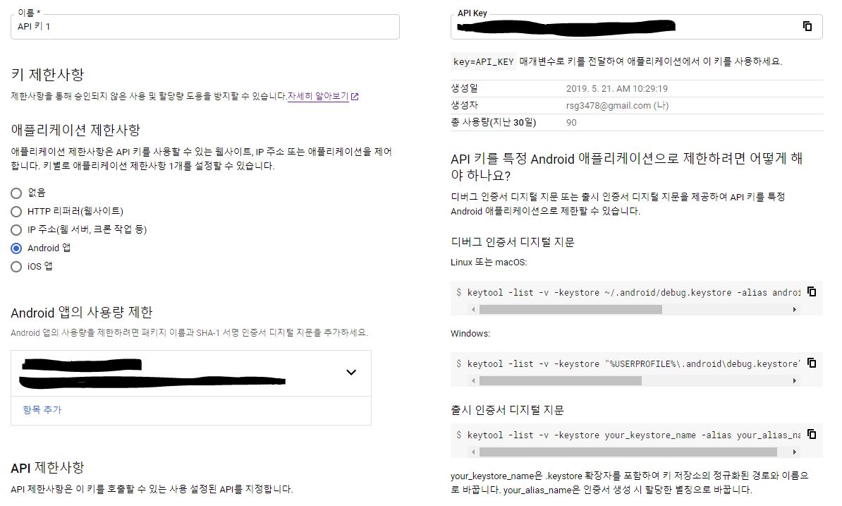 사용을 위해서는 사용 제한을 작성해 주어야 하는데 페키지 이름은 작성하고 있는 프로젝트의 이름이고 SHA-1 인증서 디지털 지문은 Windows에서 발급받아야 합니다.