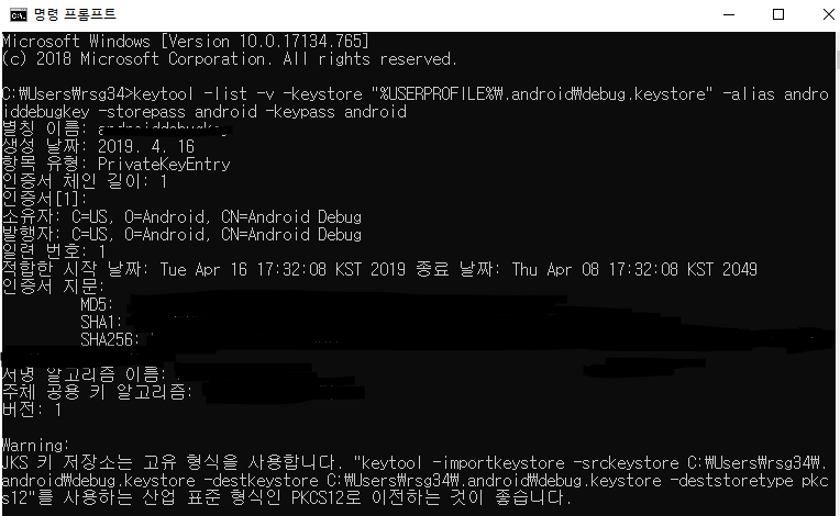 2) SHA-1 인증서 디지털 지문은 명령프롬프트창을 열고 keytool -list -v -keystore "%USERPROFILE%\.android\debug.keystore" -alias androiddebugkey -storepass android -keypass android를 붙여넣으면 나오는 SHA-1부분을 복사해 넣으면 됩니다.