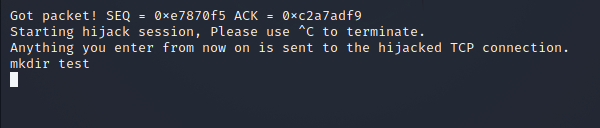 세션 하이재킹이 완료되어 클라이언트의 연결은 끊기고 Attacker의 입력이 서버로 전달됩니다. 이 상태에서 mkdir test를 입력하고 엔터를 눌러보도록 합니다.
