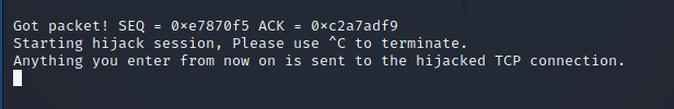 다음 명령어를 입력하게 되면 Attacker는 패킷을 탈취할 준비가 완료되었습니다. 이 상태에서 마찬가지로 Victim이 임의의 키를 입력하게 되면 패킷이 발생하고 Attacker는 패킷의 시퀀스 넘버를 변조하여 클라이언트의 연결을 끊고 클라이언트로 가장하여 서버와 통신하게 됩니다.