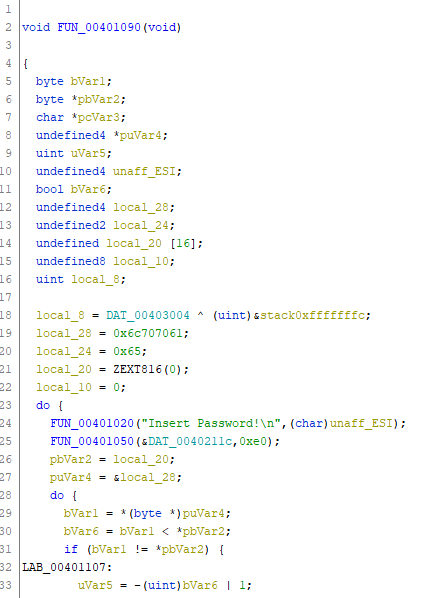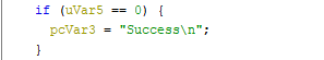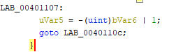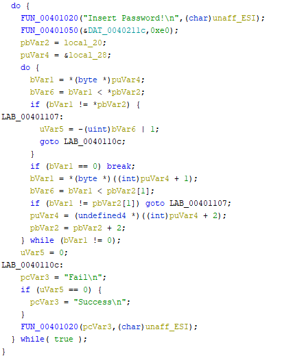 더 확실하게 파악하자면 Pseudo코드 상에서 uVar5 == 0 비교를 통해 출력 결과가 Fail 또는 Success로 값이 달라지게 되는데요, uVar5은 LAB_00401107이 실행되냐에 따라 정해집니다. 해당 프러시저가 실행되면 1과 OR 연산을 하므로 절대 0이 될 수 없으며 그대로 Fail이 출력하게 되는 것이죠.