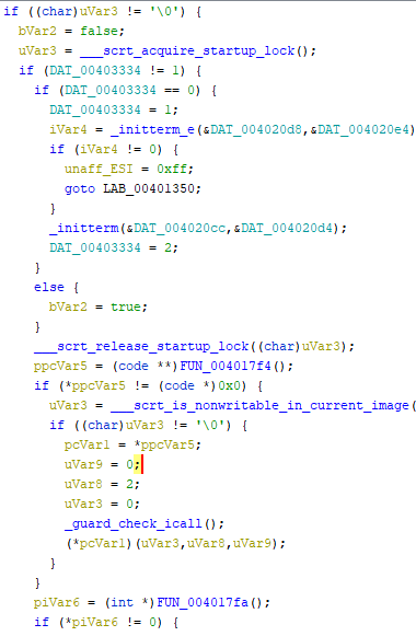 entry내에서도 여러 함수들이 호출됩니다만 main 함수와는 상관없는 함수들입니다. 예를 들어 Microosft 문서에 의하면 _security_init_cookie 함수는 전역 보안 쿠키로 버퍼 보안 검사를 통해 컴파일된 코드와 예외 처리를 사용하는 코드에서 버퍼 오버런을 방지한다고 합니다.