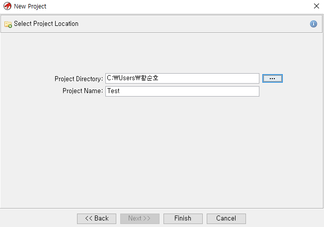 마지막 설정입니다. 프로젝트를 저장할 디렉토리와 이름을 설정합니다. 프로젝트 이름은 Test로 정하고 Finish를 누르겠습니다.