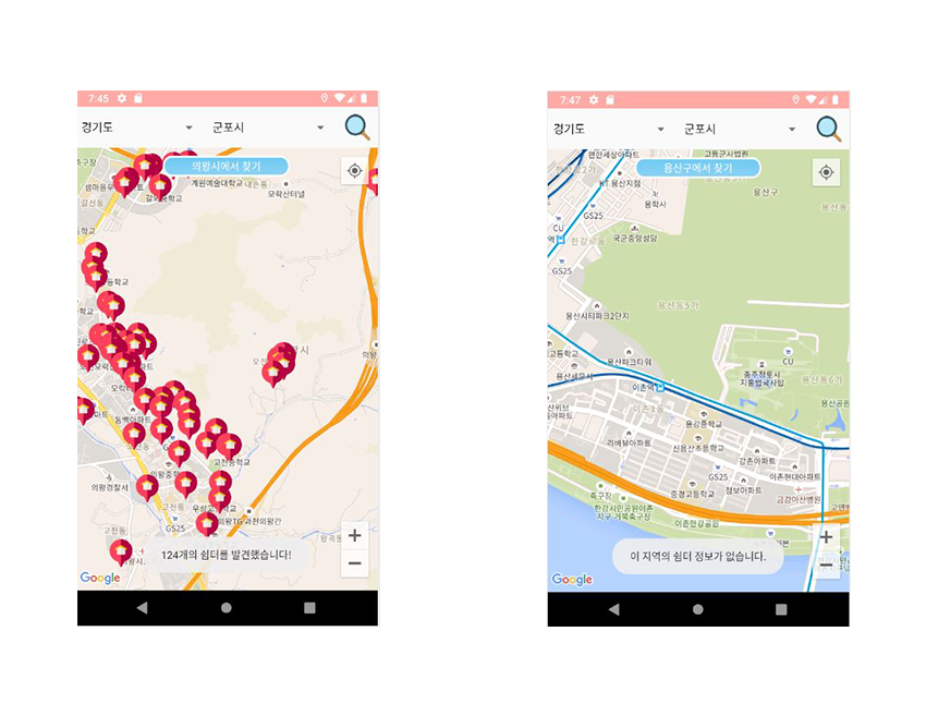 주소가 있다면 무더위쉼터의 개수를 받아 "OO개의 쉼터를 발견했습니다!"를 화면 하단에 잠시 표시해주고 없다면 "이 지역의 쉼터 정보가 없습니다."를 화면 하단에 잠깐 표시합니다.