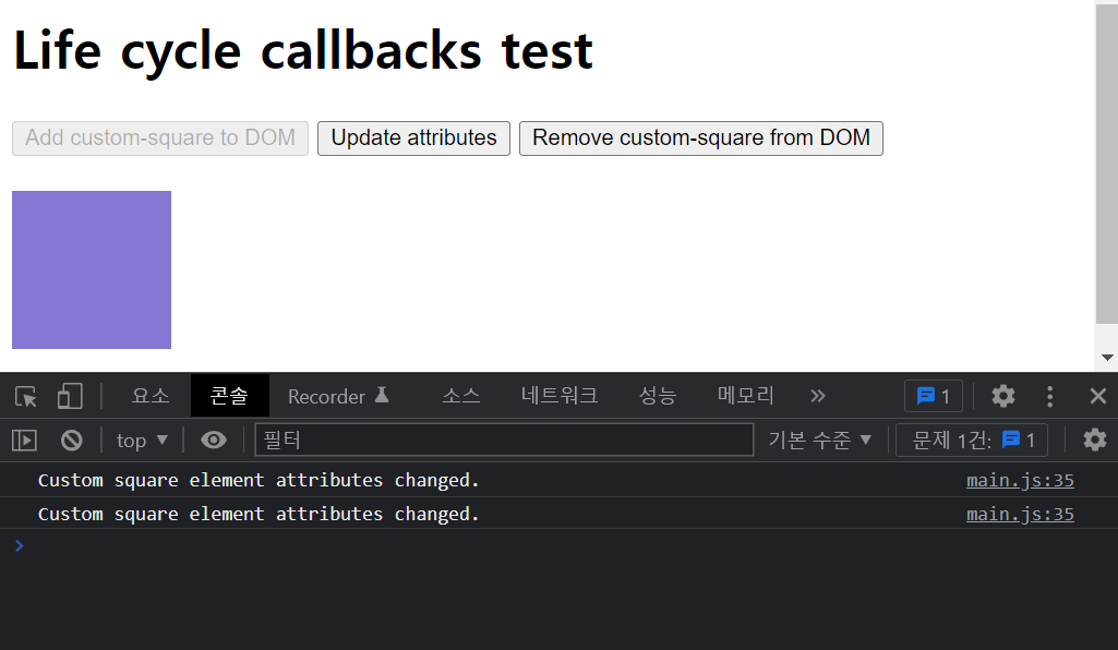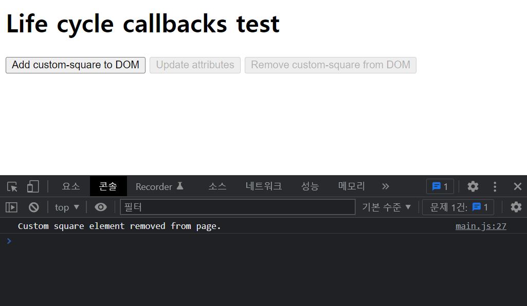 'Remove custom-square from DOM' 버튼을 클릭하면, html에서 custom-square 요소가 사라지면서 아래와 같이 disconnectedCallback이 호출된 것을 확인 할 수 있습니다.