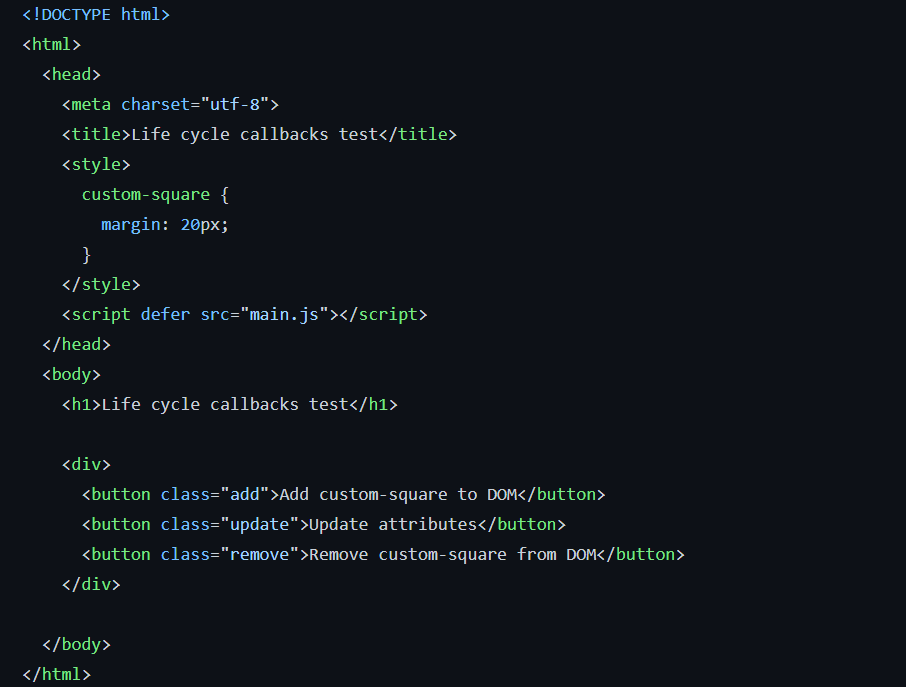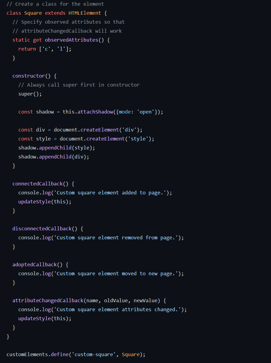 customElement를 사용할 때, 필수적인 생성자 이외에 아래와 같이 클래스 정의 내부에 해당 요소의 생명 주기별 몇가지 콜백을 추가로 정의할 수 있습니다.