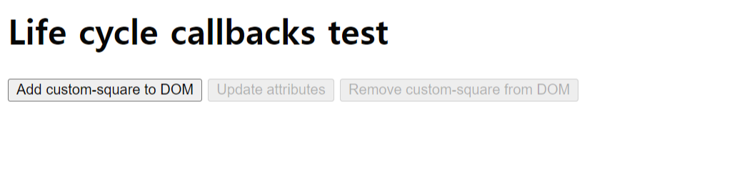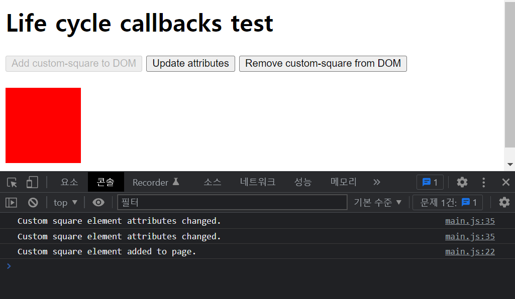 'Add custom-square to DOM' 버튼을 클릭하면, 아래와 같이 빨간색 상자가 생성되면서 attributeChangedCallback와 connectedCallback이 호출된 것을 알 수 있습니다.