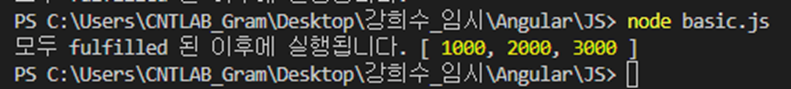 이 방법은 하나 이상의 Promise 객체를 한 번에 실행하여 결과를 출력하는 방식입니다.