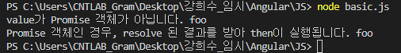 또는 아래와 같이, value가 Promise 객체가 아니면, value 인자를 내보내면서 then 메서드를 실행합니다.
