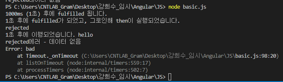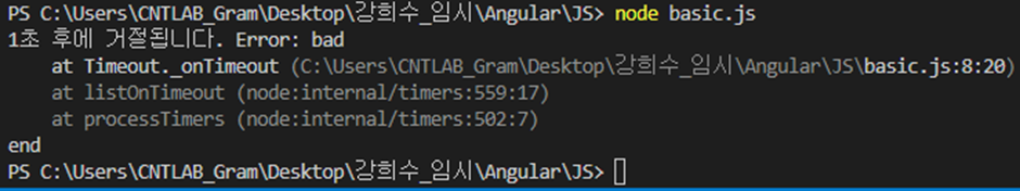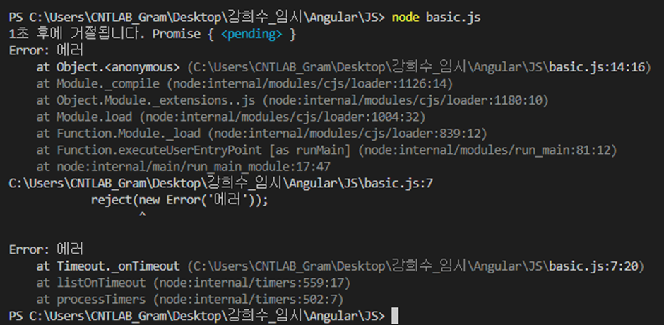 위의 reject 결과는 아래와 같이 먼저 출력되는 에러와 1초 후 출력되는 에러를 확인할 수 있습니다.