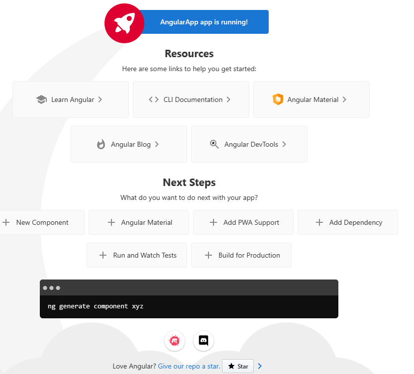 Anulgar 앱의 기본포트는 4200번으로 아래 출력된 URL로 들어가면 Angular 화면이 보입니다.