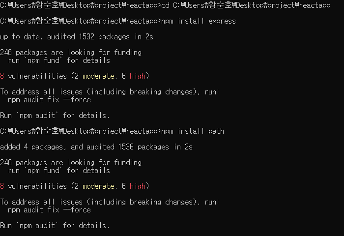 cmd에서 NodeJS 프로젝트 폴더로 이동 후 실행을 위해 express와 path 모듈도 설치해 줍니다.