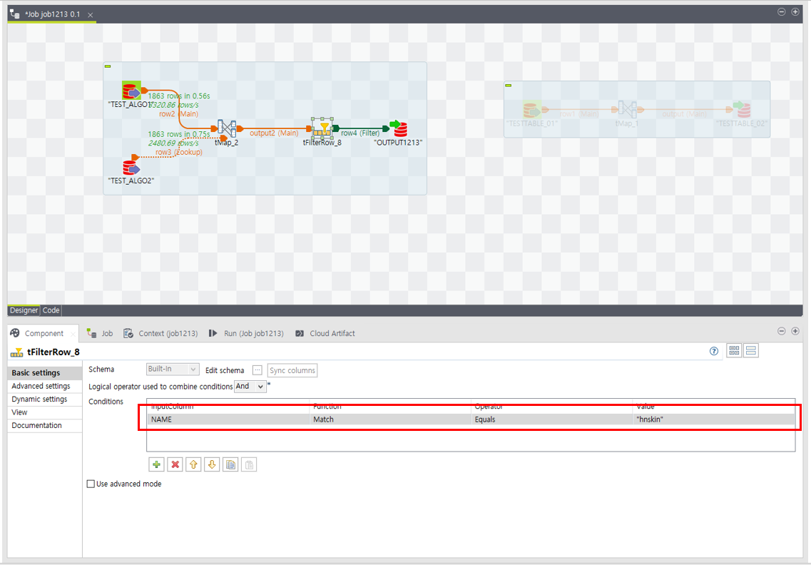 다음은 데이터 이행중에 tFilterRow 기능을 통해서 필터에 해당하는 값만 뽑아내서 Target에 넣는 기능입니다.