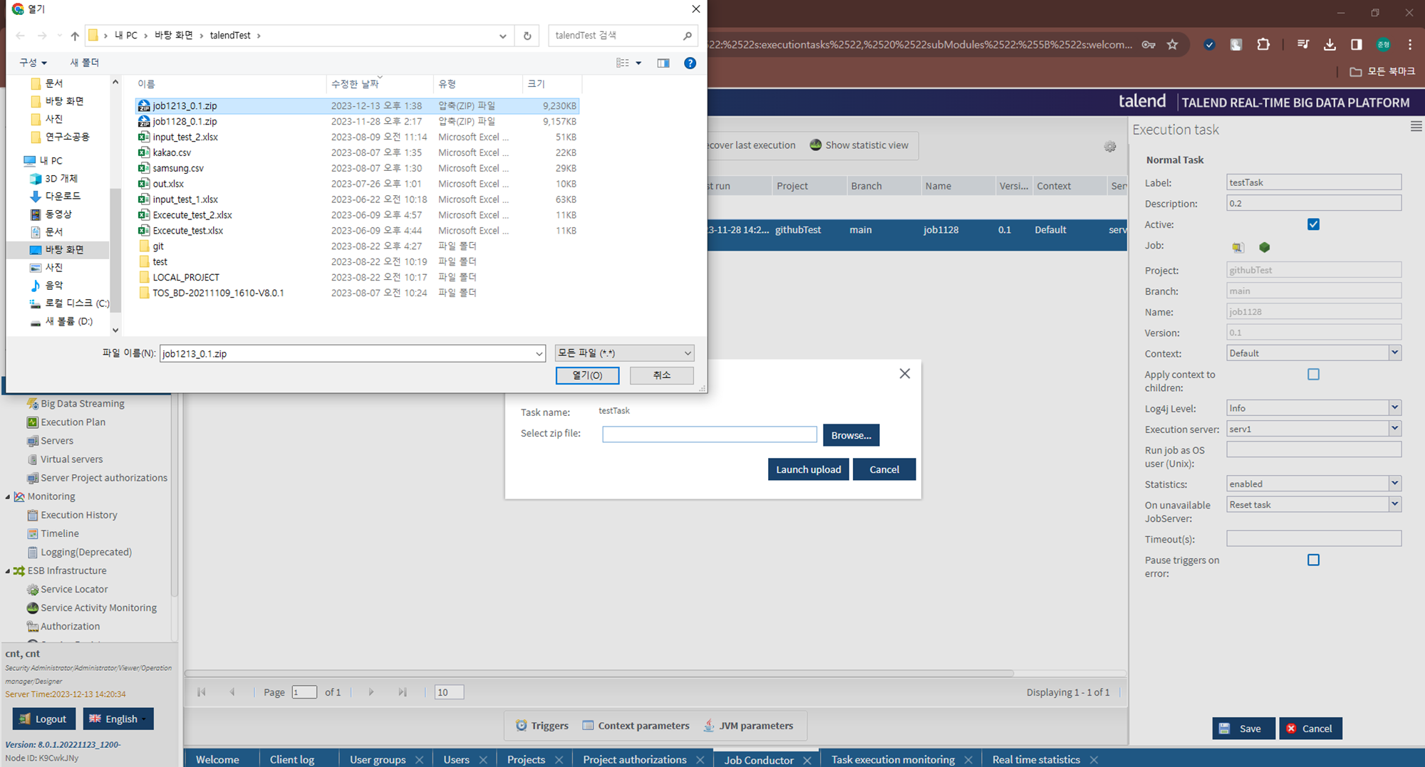 Task를 하나 만들고 항목들을 입력하고 Talend Studio에서 Build해서 만든 Job zip파일을 불러오겠습니다.