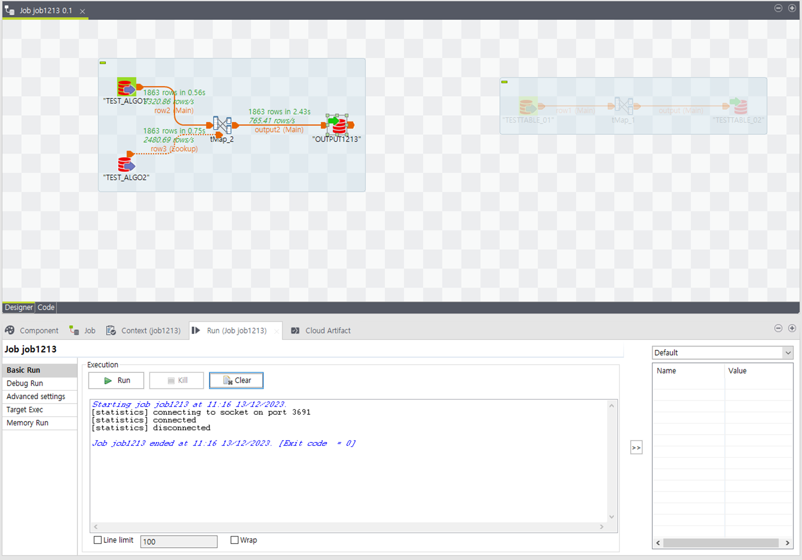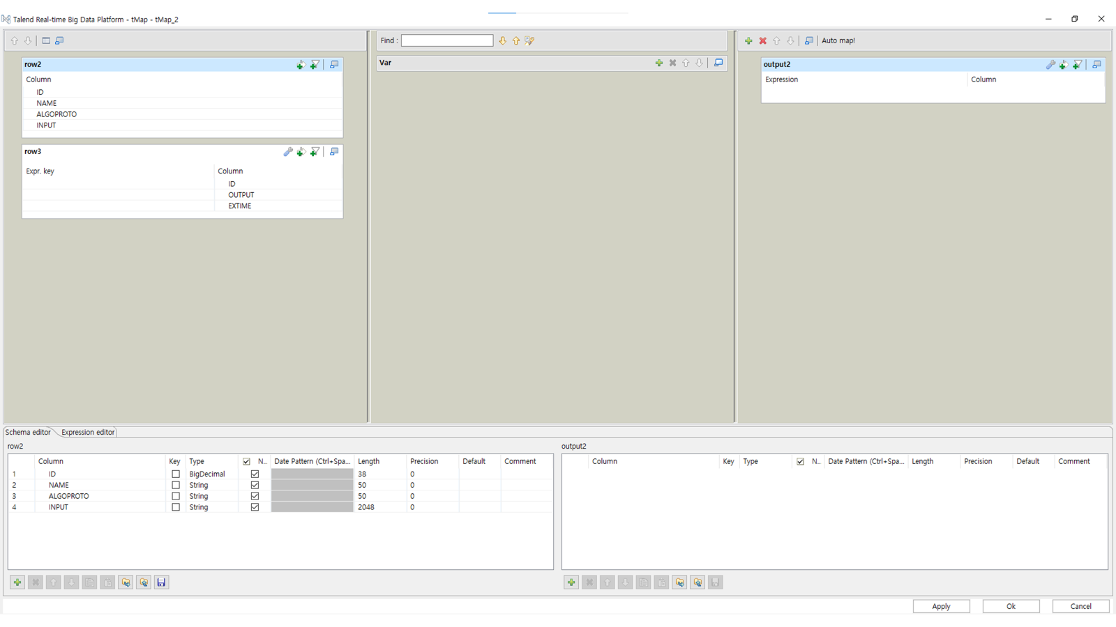 tMap에 들어오면 다음과 같이 왼쪽에 테이블 2개 오른쪽에 Target테이블 1개 배치되어 있습니다.