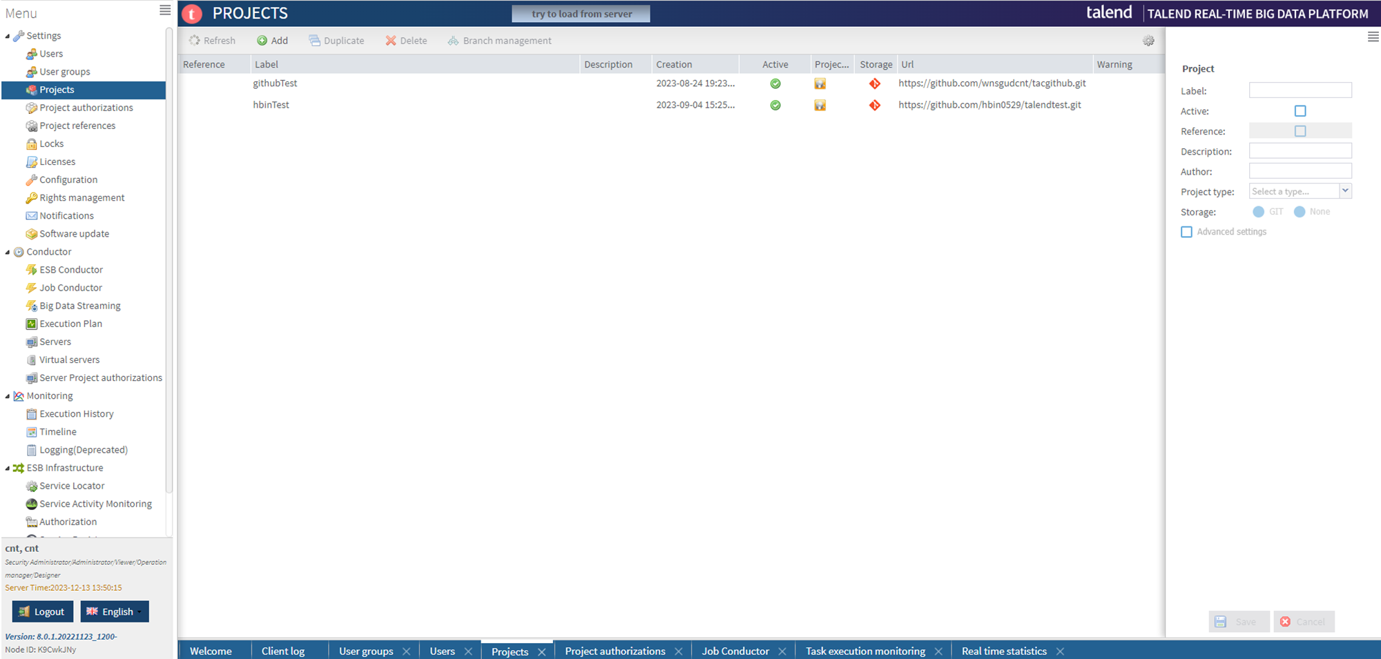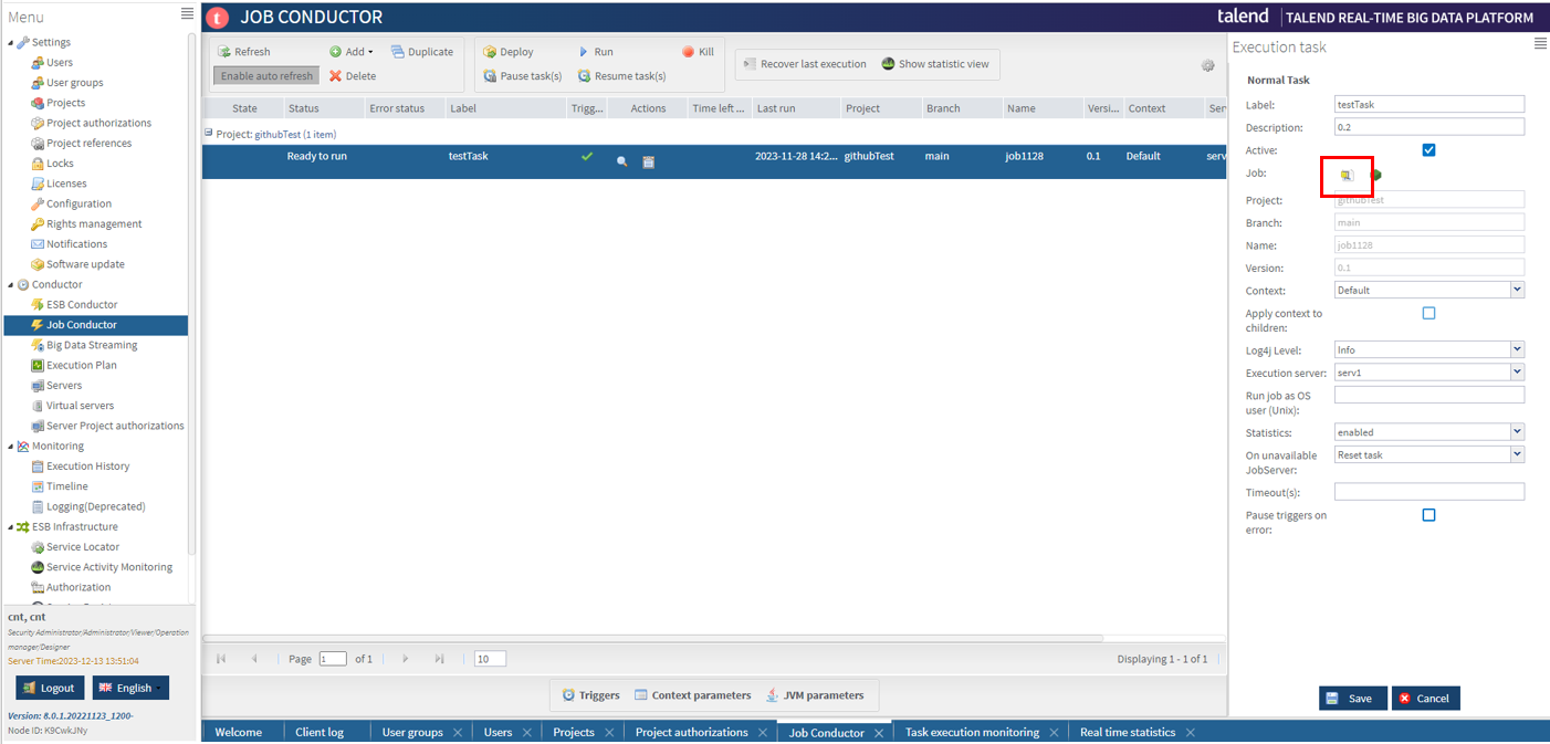 Job을 불러올 때는 Talend Studio에서 TAC에 Project를 연결해서 Job을 만들어야 넣을 수 있습니다.
