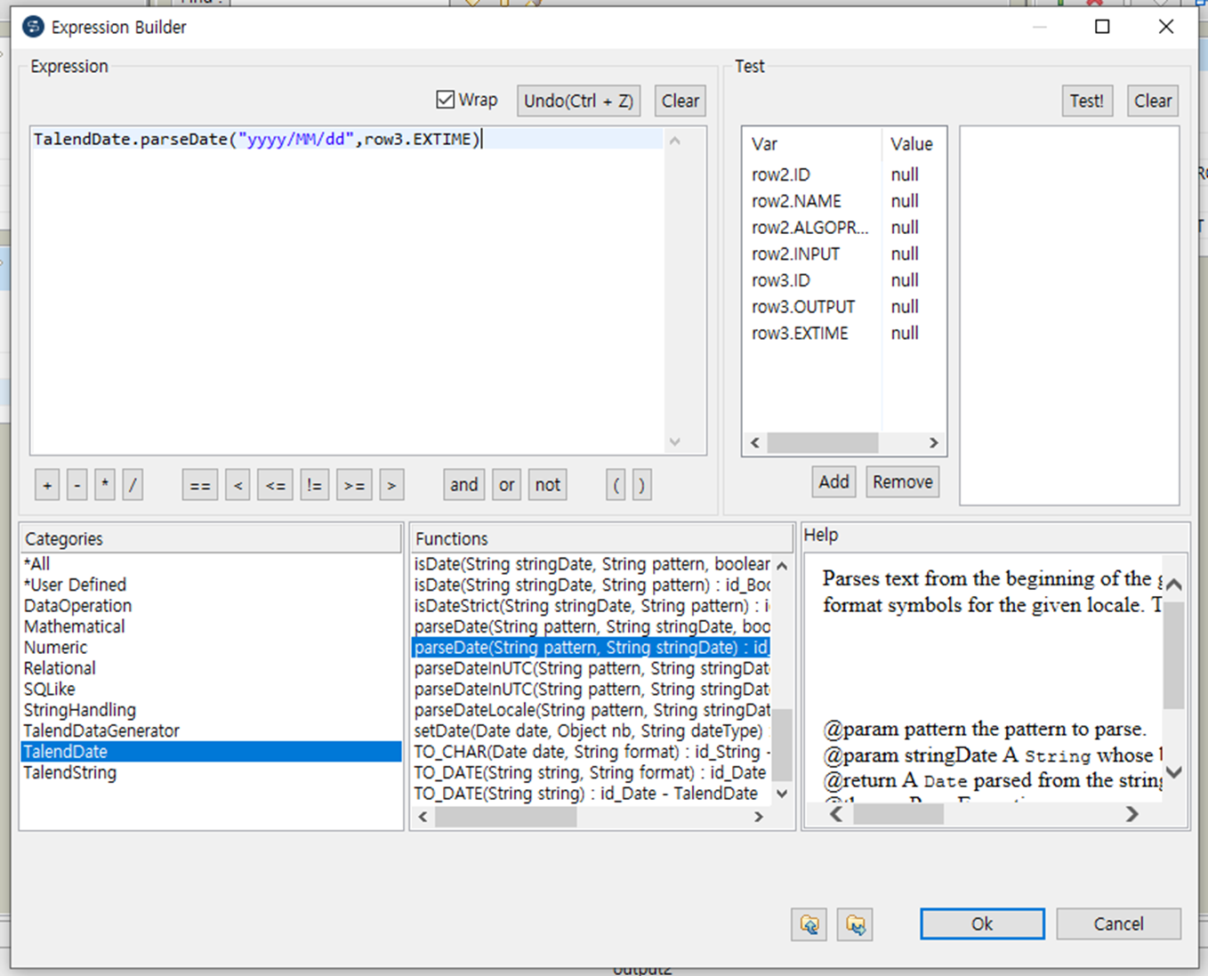 TalendDate 함수중에 parseDate 함수를 이용해서 String -> Date 타입으로 변경해 보겠습니다.