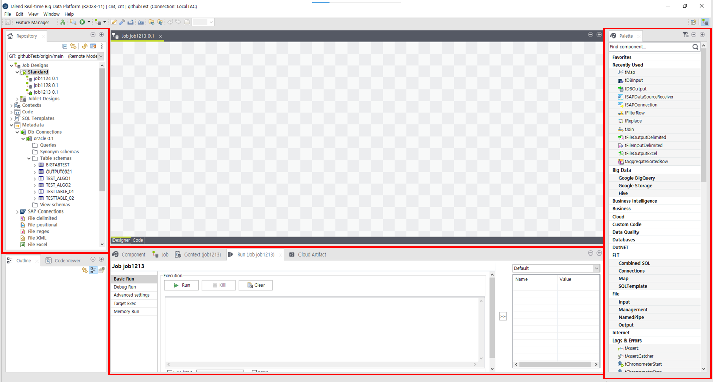 오른쪽 Palette에서 다양한 Talend 기능들을 Drag & Drop으로 Job을 만들 수 있습니다.