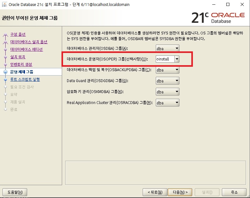 17. 데이터베이스 운영자(OSOPER)그룹(선택사항) 은 oinstall 로 설정 후 다음으로 넘어가세요.