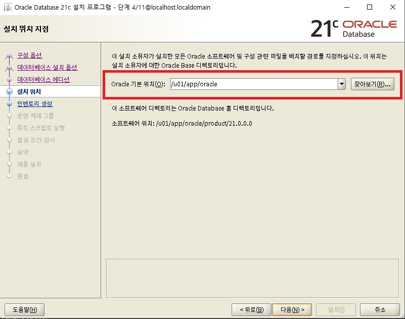 15. Oracle 기본 위치 를 /u01/app/oracle로 설정하고 다음으로 넘어가세요.
