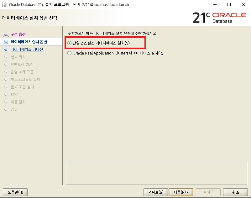 13. 단일 인스턴스 데이터베이스 설치 를 누른 후 다음으로 넘어가세요.