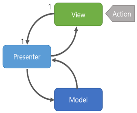 • 특징 : Presenter는 View와 Model의 인스턴스를 가지고 있어 둘을 연결하는 접착제 역할을 합니다.