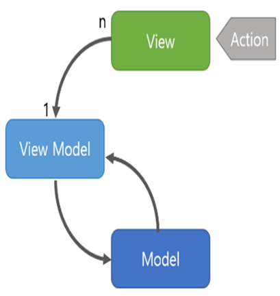 Command 패턴과 Data Binding을 이용하여 View와 View Model 사이의 의존성 제거합니다.