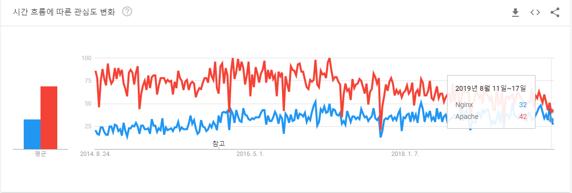 2019년 현재 서버 부담이 비교적 아파치보다 적은 NginX로 전향하는 추세로 구글 트렌드로 검색을 양을 비교 시