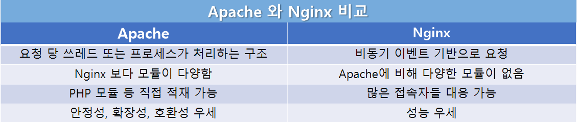 - Apache는 클라이언트 요청 하나당 스레드 하나가 처리하는 구조로 사용자가 많으면 스레드 생성, 메모리 및 CPU 낭비가 심합니다.