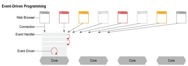- Event-Driven 처리 기반 구조는 여러 개의 커넥션을 모두 Event-Handler를 통해 비 동식 방식으로 처리해 먼저 처리되는 것부터 로직이 진행하도록 합니다. 이러한 기법의 주 사용 목적은 대화형 프로그램을 만드는 데 사용하는데 PCP 처리와 유사합니다.