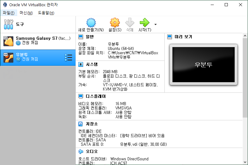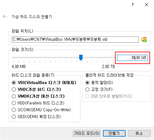 *꼭 30GB가 아니어도 괜찮습니다만 우분투에서 권장하는 디스크 크기가 25GB이므로 25GB보다 크게 설정해주세요.