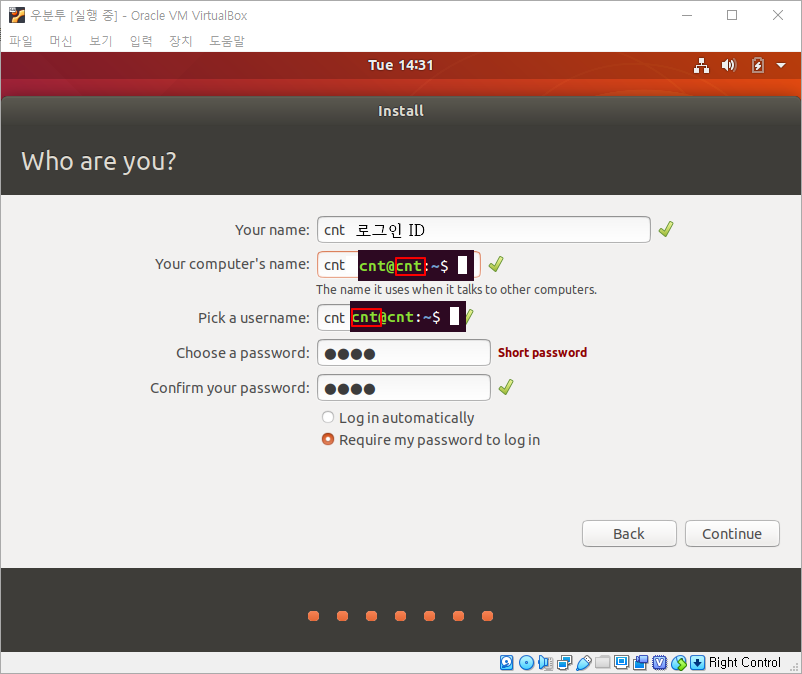 5.6 로그인정보 입력이 끝났다면 이제 우분투를 설치합니다.