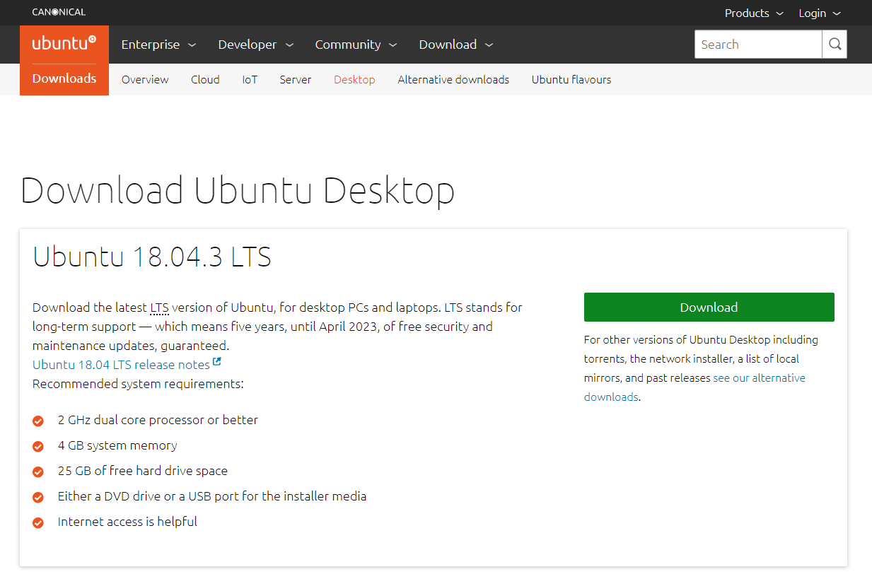 https://ubuntu.com/download/desktop 에서 Ubuntu 18.04.3 LTS를 다운로드 합니다.