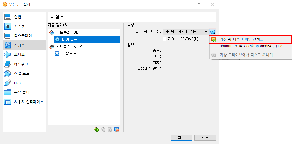 4.2 [저장소] 탭에서 [컨트롤러: IDE]의 [비어있음]을 선택하고 다운로드 한 ubuntu-18.04.3-desktop-amd64.iso 파일을 선택해줍니다.