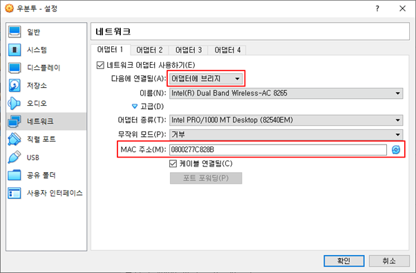 4.3 [네트워크]탭에서 NAT을 [어댑터에 브릿지]로 변경하고 [고급]을 눌러 MAC주소를 [새로고침] 합니다.