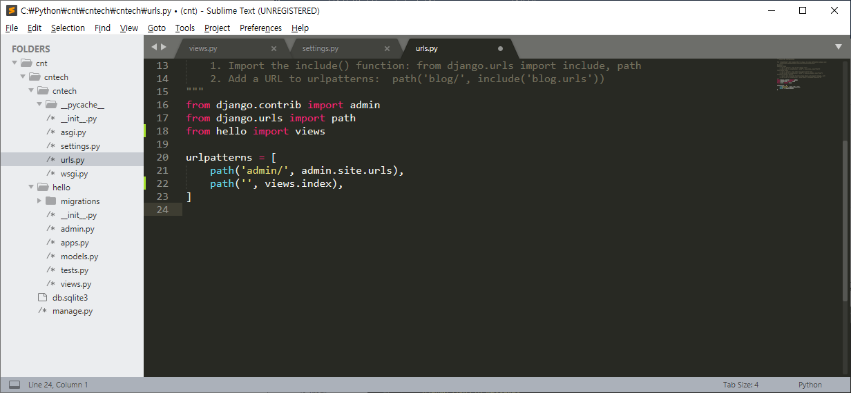 index 함수를 호출하기 위해 앱 폴더 안의 settings.py와 urls.py에 환경설정을 해주어야 합니다.