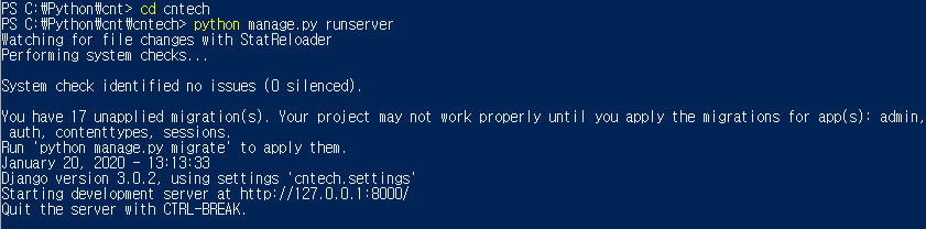 장고 프로젝트를 설치한 폴더에서 서버를 실행합니다.