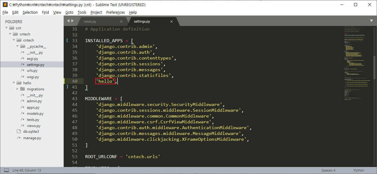 우선 settings.py의 INSTALLED_APPS에 생성한 앱을 추가합니다.