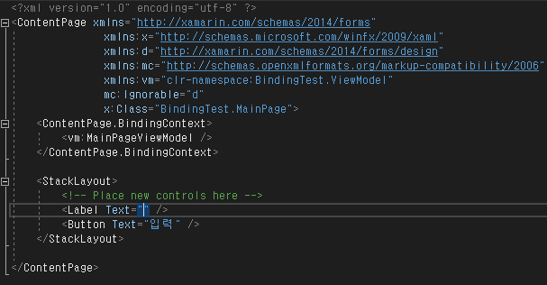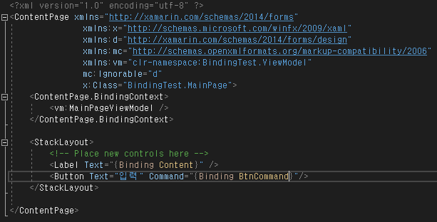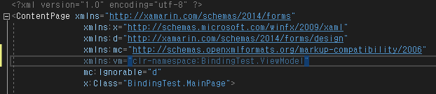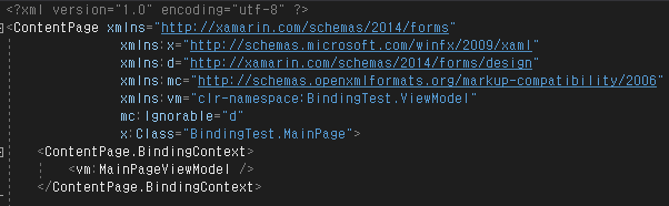 ViewModel의 참조경로를 추가한 후 ContentPage에 앞에서 만들었던 MainPageViewModel 클래스를 바인딩 해줍니다.