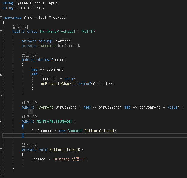 _content라는 변수는 string값을 담을 변수이고 _btnCommand는 이벤트와 연결하기 위한 변수입니다. _btnCommand와 같은 이벤트와 연결하는 변수는 Property에서 OnPropertyChanged를 호출하지 않아도 됩니다. 그리고 _btnCommand에 Command클래스 객체로 ViewModel에 있는 메소드를 담아서 넣어줍니다.